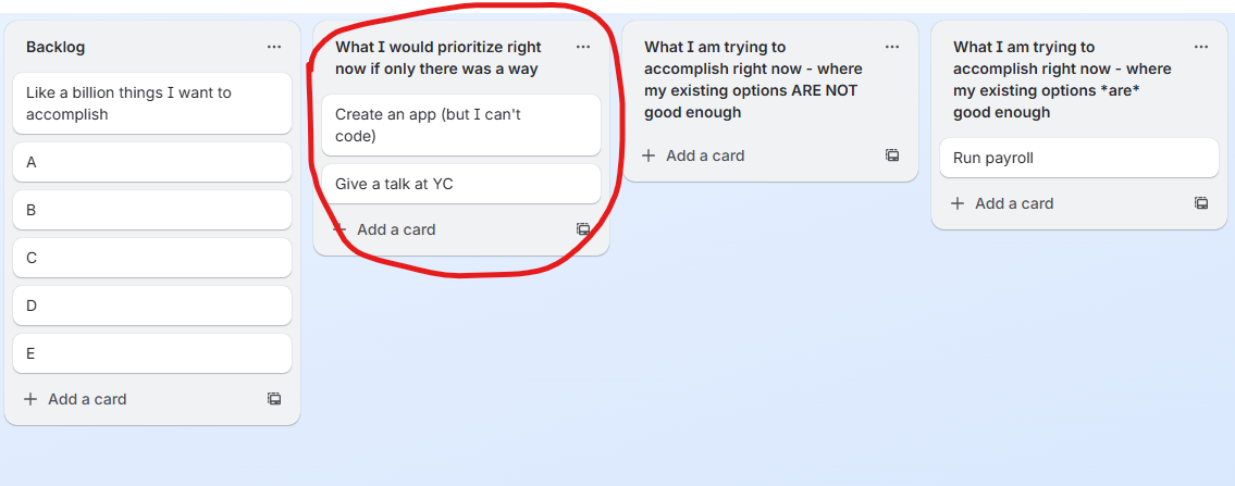 There is a fifth category - “projects we think they should prioritize” - which isn’t on their Trello board, but founders waste their lives in pursuit of products that serve this kind of project!
