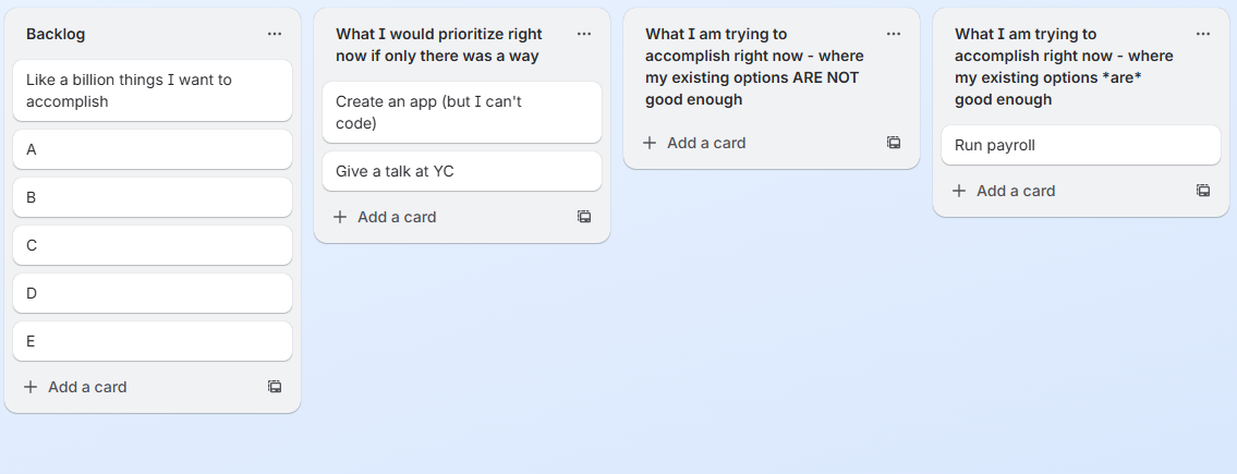 Imagine you can see a potential customer’s to-do list right now - the “Trello board in their soul.” I imagine everyone has a Trello board with four categories of projects:1