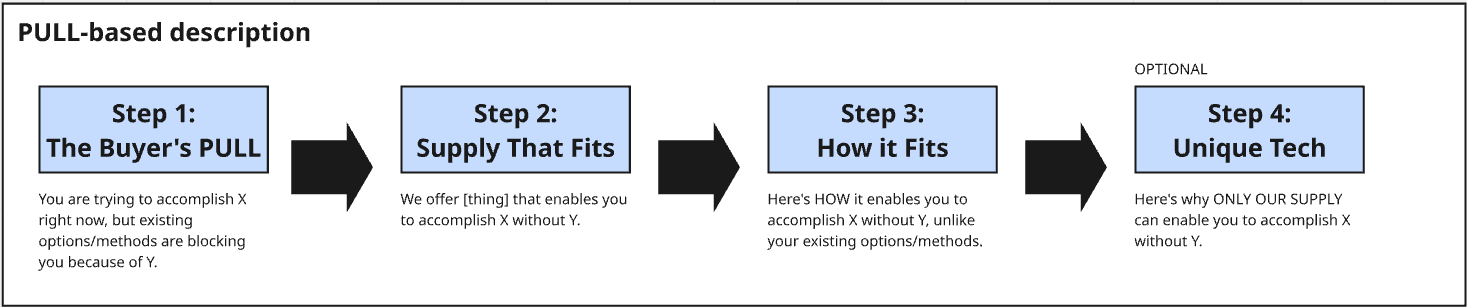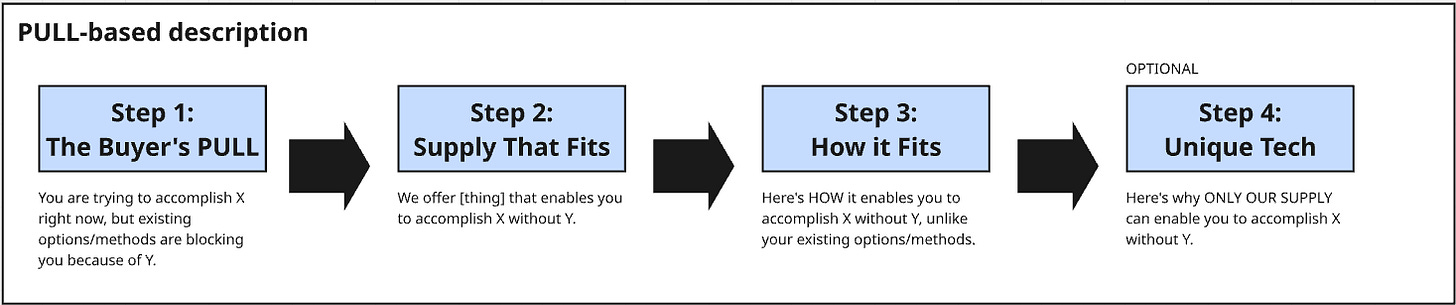 Instead, the art of describing our product is to define the thing that fits their PULL right now - with the fewest words, concepts, and visuals, so they understand that it fits, and don’t have to think very hard in order to say “yes” and buy.
