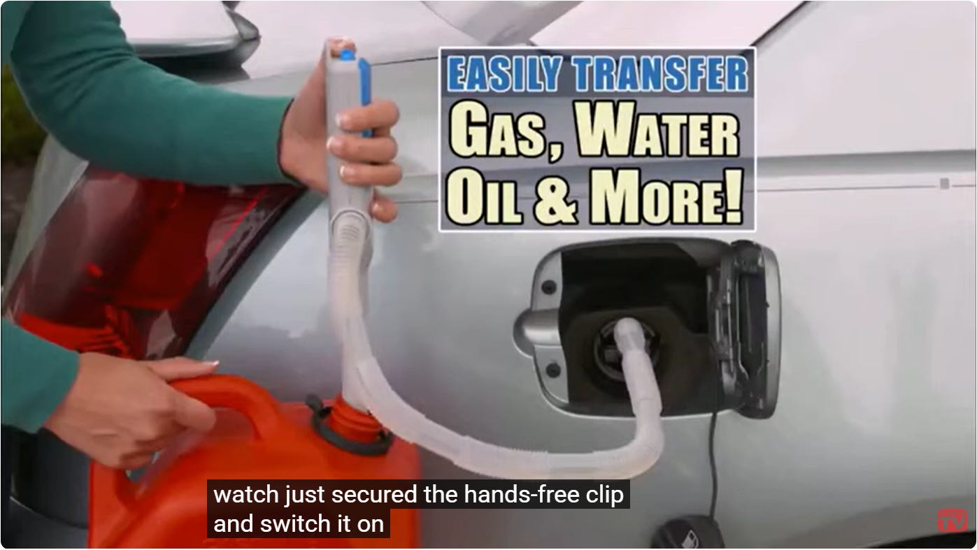 0:10 - 0:16. Watch: Just secure the hands-free clip and switch it on to transfer gas, water, oil, and other liquids quickly and easily.