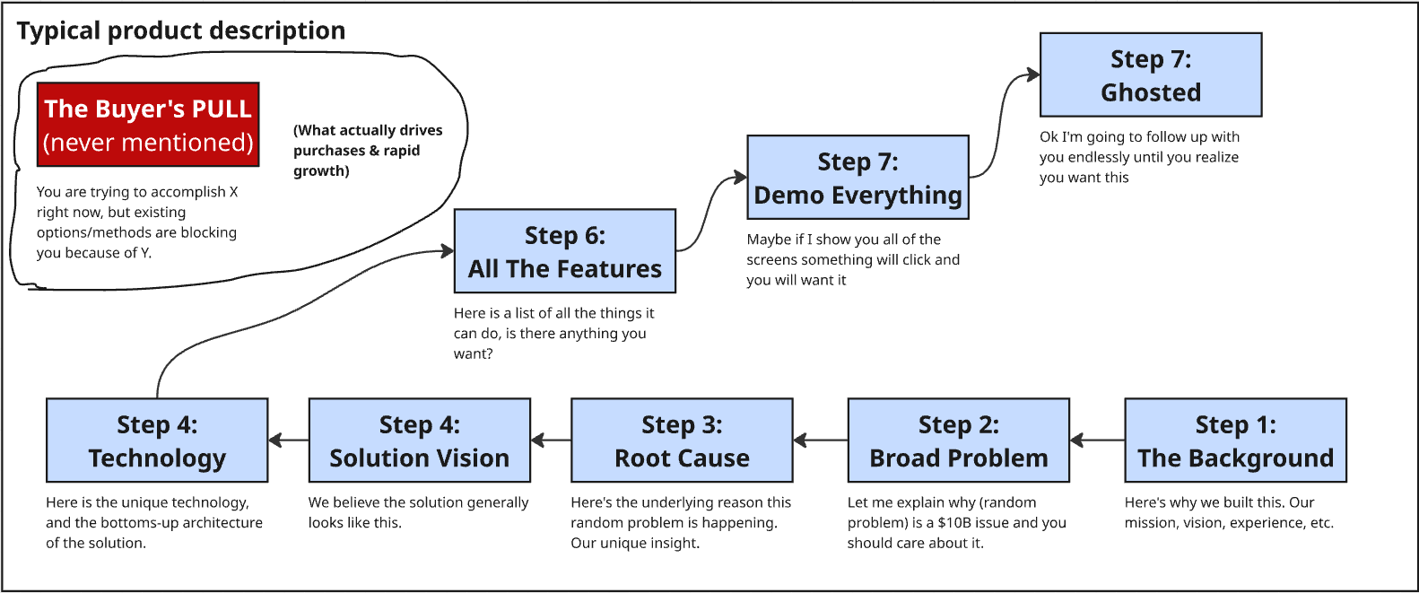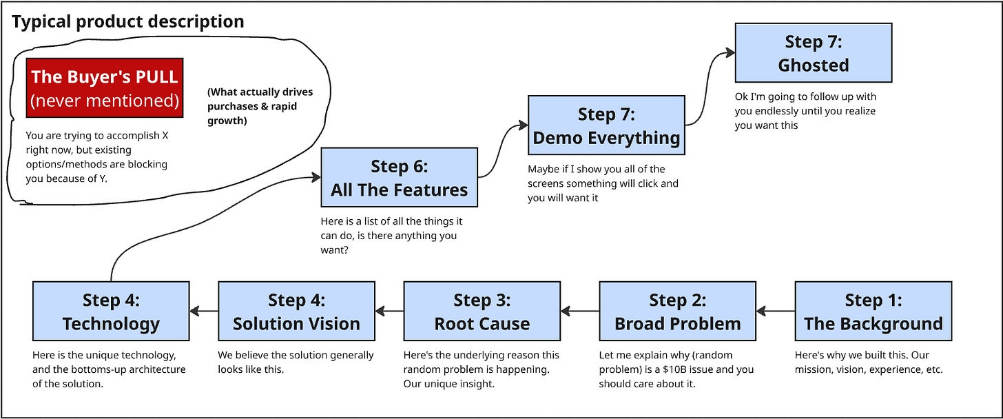 The startups that grow very fast say very few words about their product, and demo very little. They just say the right words and demo the right things - things that fit the buyer’s PULL.